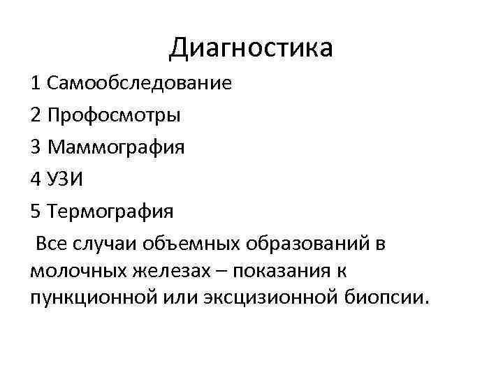 Диагностика 1 Самообследование 2 Профосмотры 3 Маммография 4 УЗИ 5 Термография Все случаи объемных образований в молочных железах – показания к пункционной или эксцизионной биопсии.