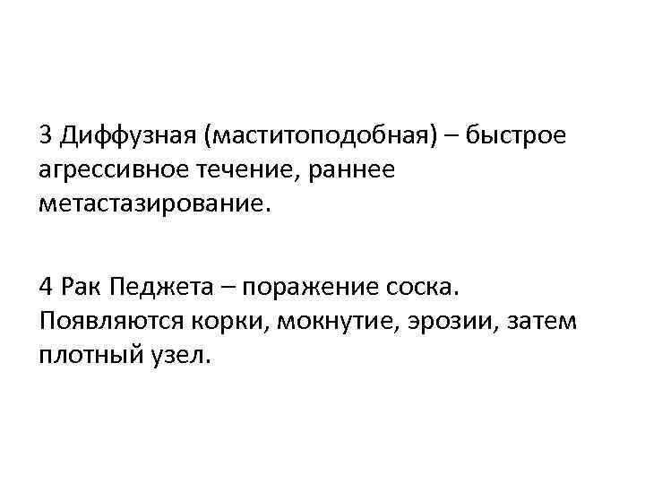 3 Диффузная (маститоподобная) – быстрое агрессивное течение, раннее метастазирование. 4 Рак Педжета – поражение соска. Появляются корки, мокнутие, эрозии, затем плотный узел.