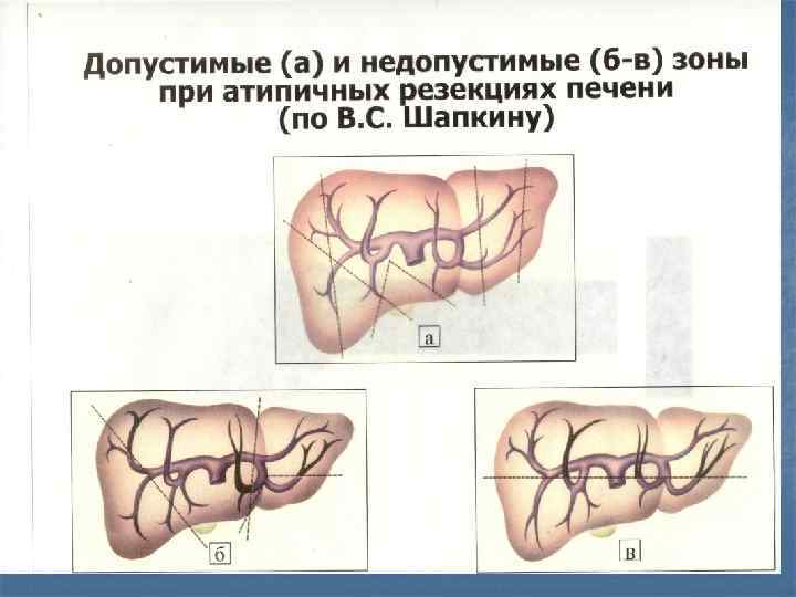 Хирургическое лечение I. Радикальные операции. 1. Резекция печени: а) правосторонняя гемигепатэктомия; б) правосторонная расширенная гемигепатэктомия; в) левосторонняя гемигепатэктомия; г) левосторонняя расширенная гемигепатэктомия; д) левосторонняя кавальная лобэктомия – иссечение левой «классической» доли. 2. Тотальная гепатэктомия с ортотопической пересадкой печени