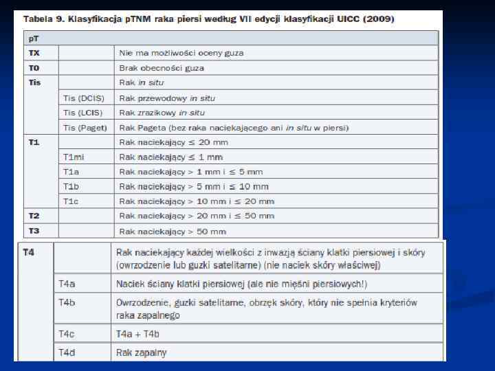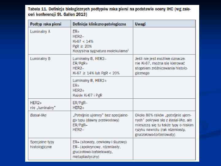 n Do najważniejszych czynników klinicznych o znaczeniu rokowniczym (ryzyko nawrotu lub zgonu) należą: Wielkość guza pierwotnego n Typ histologiczny i stopień złośliwości raka n Liczba zajętych przerzutowo węzłów pachy n Stopień ekspresji ER i Pg. R n Naciekanie około guzowych naczyń chłonnych i żylnych n Stan HER 2 n Ocena stopnia proliferacji na podstawie wskaźnika Ki 67 n