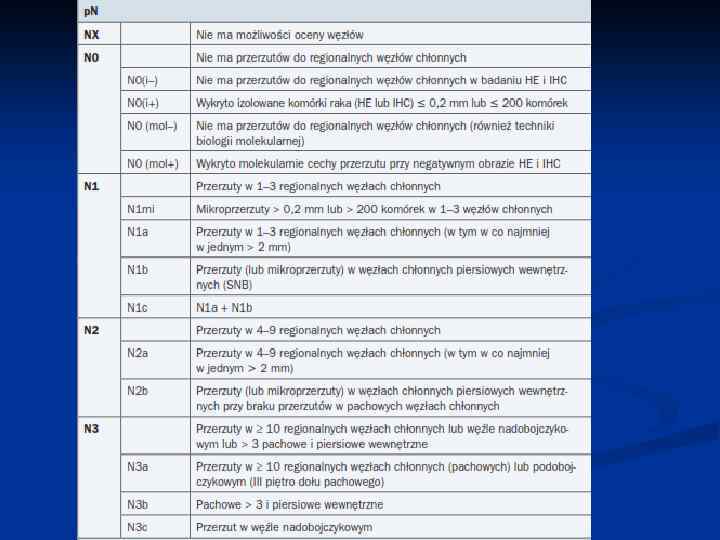 makroprzerzut w węźle wartowniczym, gdy nie planuje się limfadenektomii pachowej; n przerzuty w 1 -3 węzłach chłonnych u chorych na raka piersi o niekorzystnym fenotypie (młody wiek, choroby serca, lewa strona, wielkość guza, liczba zajętych węzłów 1 -3 lub przekraczanie torebki węzłów, inwazja naczyń, G, typ biologiczny – TNBC/HER 2 n