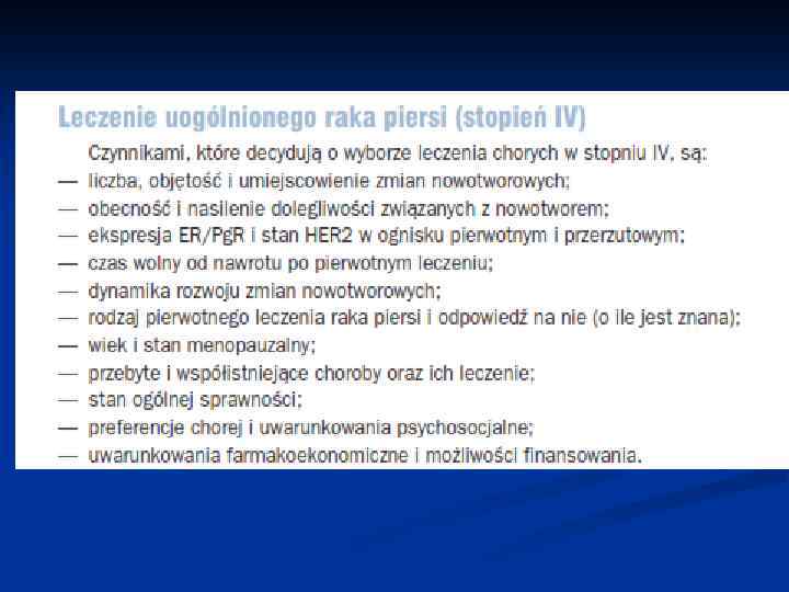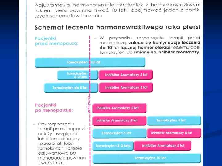 Hormonoterapia n n n Jako leczenie uzupełniajace oraz leczenie paliatywne Wybór leku zależy od stanu menopauzalnego Tamoksyfen – kwalifikują się wszystkie chore z ekspresja Er i/lub Pg. R, niezależnie od wieku i stanu menopauzalnego (czas leczenia 5 lat). Względnymi przeciwwskazaniami do zastosowania tamoksyfenu sa: zespół zakrzepowo-zatorowy w wywiadzie i przerost błony śluzowej macicy
