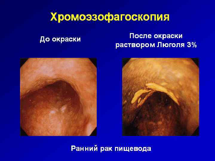 ЭЗОФАГОГАСТРОДУОДЕНОСКОПИЯ Является основным методом диагностики, который позволяет получить материал для морфологического подтверждения диагноза, а также оценить распространенность первичной опухоли по пищеводу. С целью повышения информативности метода в настоящее время могут применяться такие методики, как хромоэндоскопия, эндоскопия в узкоспектральном пучке света, аутофлюоресценция.