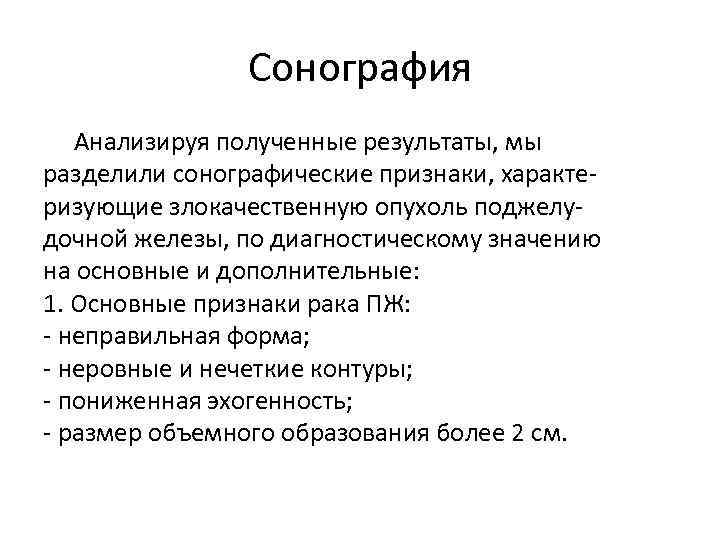 Сонография Анализируя полученные результаты, мы разделили сонографические признаки, характеризующие злокачественную опухоль поджелудочной железы, по диагностическому значению на основные и дополнительные: 1. Основные признаки рака ПЖ: - неправильная форма; - неровные и нечеткие контуры; - пониженная эхогенность; - размер объемного образования более 2 см.