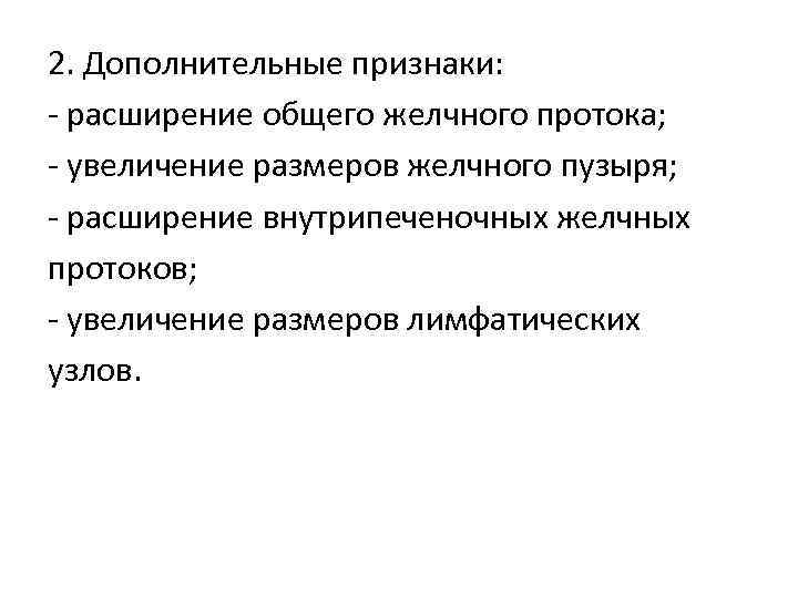 2. Дополнительные признаки: - расширение общего желчного протока; - увеличение размеров желчного пузыря; - расширение внутрипеченочных желчных протоков; - увеличение размеров лимфатических узлов.
