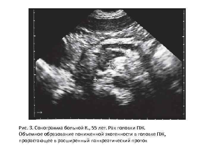 Рис. 3. Сонограмма больной К. , 55 лет. Рак головки ПЖ. Объемное образование пониженной эхогенности в головке ПЖ, прорастающее в расширенный панкреатический проток