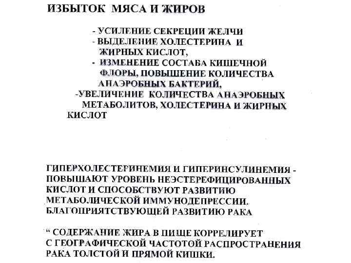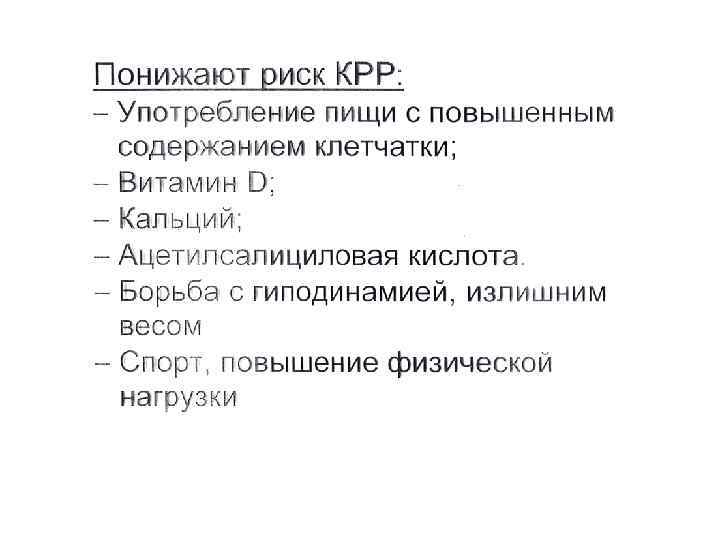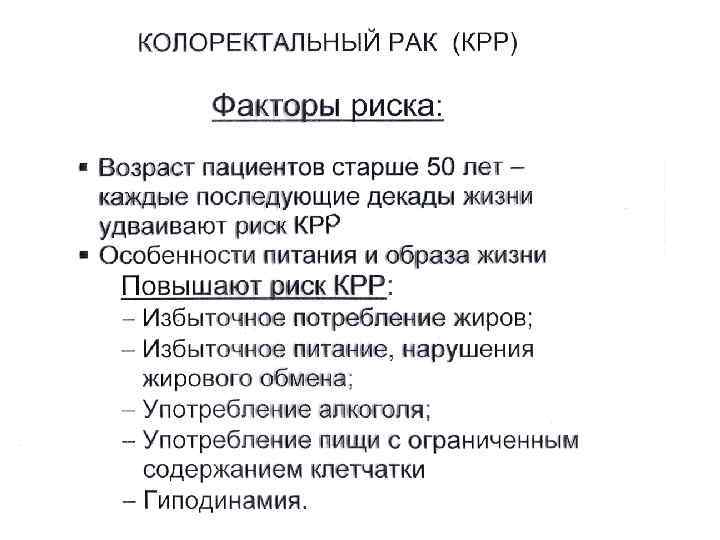 ФАКТОРЫ РИСКА КРР (продолжение) У лиц, 10 и более лет занятых на сидячей работе, риск развития рака дистальных отделов толстой кишки вдвое выше по сравнению с теми, кто подобной работой никогда не занимался. • Риск развития рака верхних отделов толстой кишки от характера профессиональной занятости не зависит. • Все отмеченные закономерности не связаны с уровнем физической деятельности вне работы