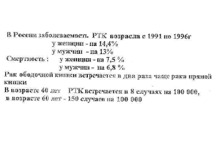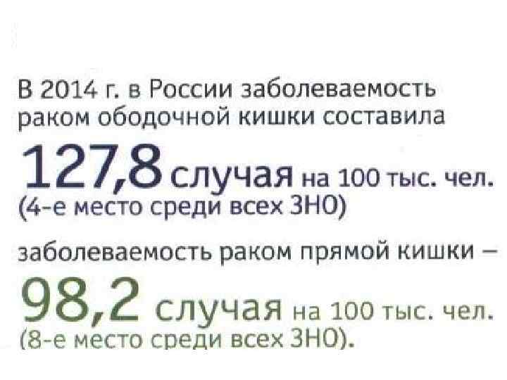РОССИЯ 2014 г III - IY стадии рака прямой и ободочной кишки • Рак прямой кишки- более 45% больных • Рак ободочной кишки – 50% больных