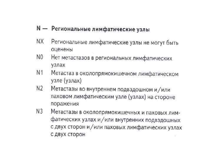 КЛАССИФИКАЦИЯ TNM 7 -ая редакция (2009) • ПЕРВИЧНАЯ ОПУХОЛЬ прямой кишки (Т) • Тх- недостаточно данных для оценки опухоли • Т 0 -признаки первичной опухоли отсутствуют Тis-преинвазивная карцинома (не прорастает базальную мембрану слизистой оболочки • Т 1 -опухоль инфильтрирует подслизистый слой • Т 2 -опухоль распространяется на мышечный слой • Т 3 -опухоль прорастает в подсерозную основу , распространяется в парарект. клетч-ку • Т 4 -опухоль прорастает окружающие органы/ткани •