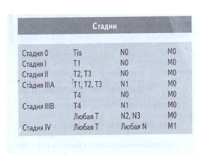 СТАДИИ Стадия 0 Тis N 0 M 0 Стадия I Т 1, Т 2 N 0 M 0 Стадия II T 3, T 4 N 0 M 0 Стадия IIA T 3 N 0 M 0 Стадия II B T 4 a N 0 M 0 Стадия II C T 4 b N 0 M 0 Стадия III любая T N 1, N 2 M 0 IIIA T 1, T 2 T 1 N 2 a M 0 IIIB T 3, T 4 T 2, T 3 T 1, T 2 N 1 N 2 b M 0 M 0 IIIC T 4 a, Т 3, Т 4 а Т 4 в N 2 a N 2 b N 1, N 2 M 0 M 0 IYA Любая T Любая N M 1 a IYB Любая Т Любая N M 1 b