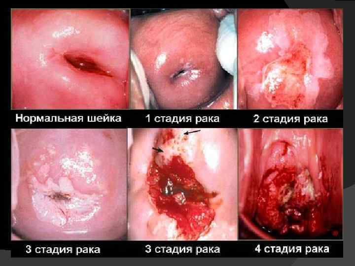 Стадии развития рака шейки матки: I стадия - рак ограничен лишь шейкой матки; II стадия - переходом опухоли на верхнюю часть влагалища, иногда – на тело матки; III стадия – переход опухоли на нижнюю часть влагалища, в тело матки и кости таза; IV стадия – переход на мочевой пузырь, прямую кишку или отдаленное метастазирование.