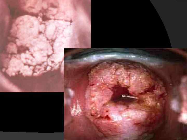 Гинекологическое исследование Экзофитный рост Разрастания по типу цветной капусты, легко разрушающиеся и кровоточащие прикосновении При распаде гноевидные или цвета мясных помоев выделения с зловонным запахом Наложение фибрина серого цвета