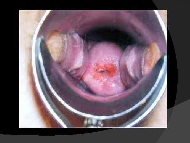 Клиника Жалобы: Кровотечения при раке шейки матки бывают мажущими или обильными. Могут возникать в результате незначительной травмы (спринцевание, твёрдый стул, влагалищное исследование пальцем или зеркалами, половой акт). Бели. Обычно водянистые или окрашены кровью. Имеют вид мясных помоев, без запаха. При присоединении инфекции может появляться зловонный запах. Бели возникают при отторжении некротических участков.