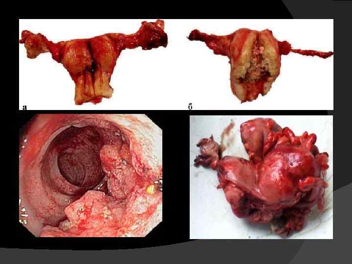 При прорастании опухоли в мочевой пузырь или прямую кишку по- являются симптомы, связанные с поражением этих органов: Нарушения мочеиспускания Атония кишечника Примесь крови в моче и кале Пузырно-влагалищные, пузырно- шеечные и влагалищно-кишечные свищи.