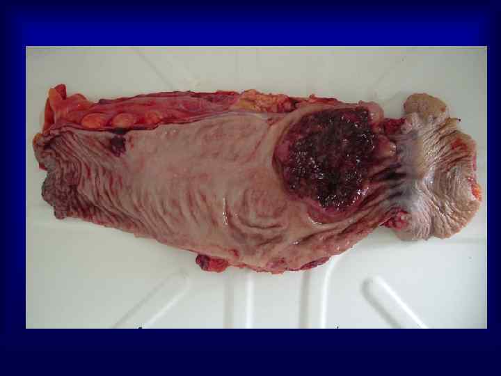 Клинические проявления рака ободочной кишки • Боли в животе – отмечаются у 80% больных при правосторонней локализации встречаются в 2 -3 раза чаще • Нарушение моторно-эвакуаторной функции ТК – 85% больных: чувство тяжести в животе, потеря аппетита, тошнота, запоры, вздутие живота, приступообразные боли • Патологические выделения из прямой кишки – слизь, гной, кровь, опухолевые массы. При левосторонней локализации опухоли 60%, правосторонней – 18%. • Изменение общего состояния больного – 75% больных: слабость, недомогание, потеря веса, быстрая утомляемость • Наличие пальпируемой опухоли – 40 -60% больных