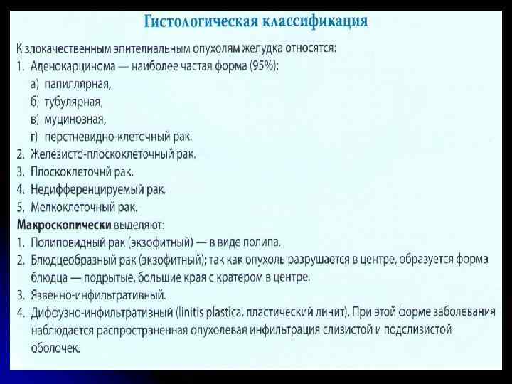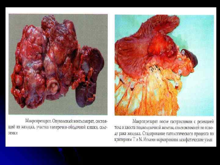 Метастазирование l Лимфогенный – метастаз Вирхова (в левые надключичные лимфоузлы), метастаз Жозефа (в пупок), метастаз Крукенберга (в яичники), метастаз Шницлера (в дугласово пространство) l Гематогенный – печень (чаще), легкие, плевра, поджелудочная железа, почки (реже) l Имплантационный – канцероматоз брюшины