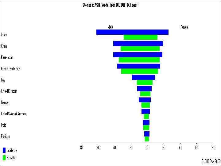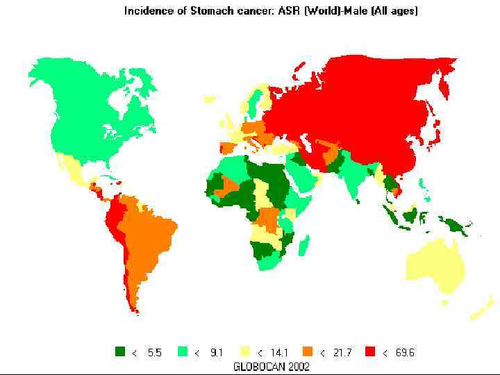 Эпидемиология Рак желудка занимает 2 -ое место по частоте заболеваемости у мужчин, у женщин – 3 -е место l Мужчины : женщины – 2 : 1 l Пик заболеваемости – 65 -70 лет l Высокая заболеваемость – Япония, Китай, Россия, Казахстан l Имеется тенденция к снижению заболеваемости и смертности l