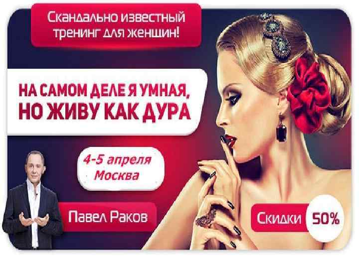 Раков Павел Александрович – известный российский учредитель международного тренингового центра Павла Ракова, личностный тренер, психолог-практик, ведущий авторской телепередачи «Мои прекрасные…» на РЕН-ТВ, соведущий телепередачи «Женское счастье» на канале «Россия-1» , автор 6 тренингов и 5 книг, награжден медалью Российского Международного Регистра комплементарной медицины за просветительскую деятельность в нетрадиционной (народной) медицине. Авторские тренинги Павла Ракова: 1)"Где взять силы для успеха" 2)Техника управления энергией взаимодействия 3)Мужской тренинг 4)"На самом деле, я - умная, но живу как дура" 5)Ораторское искусство 6)Креативное мышление Автор 5 книг - «Виктория» , « 1+1» , «Авторская школа» , «Главное - не думать о белом слоне» , "Где взять силы для успеха".