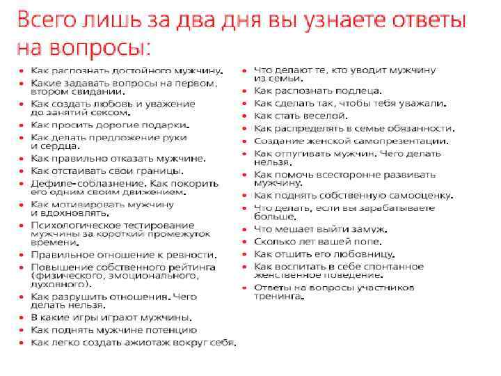 Есть женщины, которые имеют все, чего пожелают - мир как будто бы расстилается у их ног, они умеют решать любые проблемы и с легкостью достигают своих целей, они успешны во всем, вызывают зависть и достойны восхищения! После тренинга женщинам предлагают выйти замуж, дарят квартиры, улучшается качество секса даже у тех кто забыл что это такое, многие бросают курить, и снижают вес.