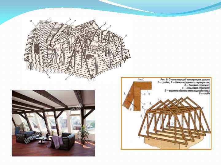 Влияние геометрии крыши на каркас мансарды: А - в ломаной крыше пролетом не более 6 м; Б - в рамной конструкции мансарды пролетом 6 -12 м: 1 - треугольная ферма; 2 - стойки; 3 - подкосы стоек; 4 - подкосы рамы; 5 - прогон; 6 - балки перекрытия; 7 - наружные стены; 8 - внутренняя стена; 9 - стропила; 10 - ригель (перекрытие мансарды); 11 обрешетка