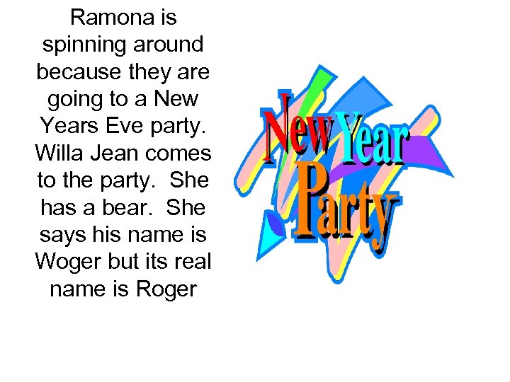 Ramona is spinning around because they are going to a New Years Eve party. Willa Jean comes to the party. She has a bear. She says his name is Woger but its real name is Roger