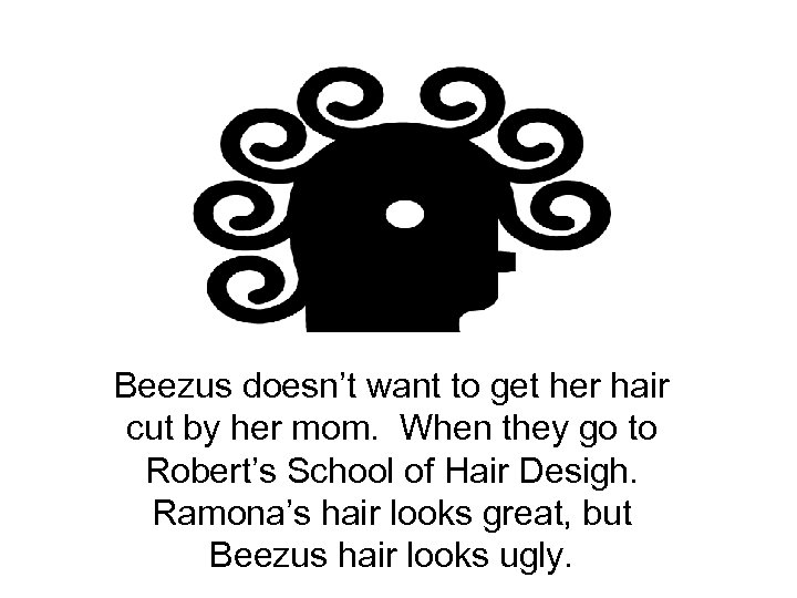 Beezus doesn’t want to get her hair cut by her mom. When they go to Robert’s School of Hair Desigh. Ramona’s hair looks great, but Beezus hair looks ugly.