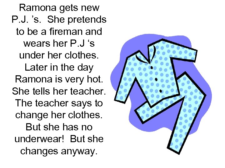 Ramona gets new P. J. ’s. She pretends to be a fireman and wears her P. J ‘s under her clothes. Later in the day Ramona is very hot. She tells her teacher. The teacher says to change her clothes. But she has no underwear! But she changes anyway.