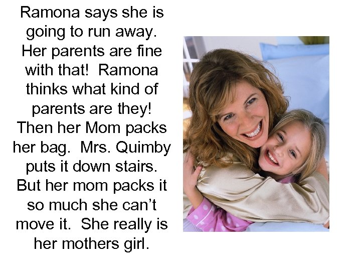 Ramona says she is going to run away. Her parents are fine with that! Ramona thinks what kind of parents are they! Then her Mom packs her bag. Mrs. Quimby puts it down stairs. But her mom packs it so much she can’t move it. She really is her mothers girl.