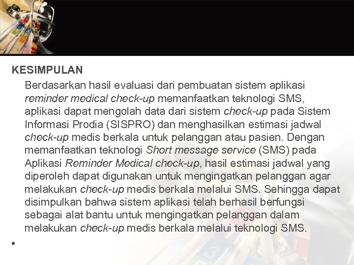 KESIMPULAN Berdasarkan hasil evaluasi dari pembuatan sistem aplikasi reminder medical check-up memanfaatkan teknologi SMS, aplikasi dapat mengolah data dari sistem check-up pada Sistem Informasi Prodia (SISPRO) dan menghasilkan estimasi jadwal check-up medis berkala untuk pelanggan atau pasien. Dengan memanfaatkan teknologi Short message service (SMS) pada Aplikasi Reminder Medical check-up, hasil estimasi jadwal yang diperoleh dapat digunakan untuk mengingatkan pelanggan agar melakukan check-up medis berkala melalui SMS. Sehingga dapat disimpulkan bahwa sistem aplikasi telah berhasil berfungsi sebagai alat bantu untuk mengingatkan pelanggan dalam melakukan check-up medis berkala melalui teknologi SMS. •