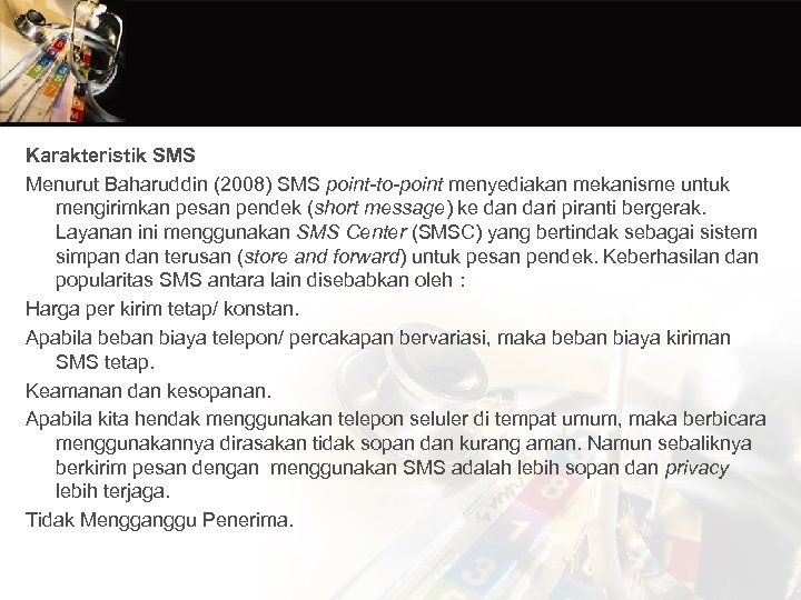 Karakteristik SMS Menurut Baharuddin (2008) SMS point-to-point menyediakan mekanisme untuk mengirimkan pesan pendek (short message) ke dan dari piranti bergerak. Layanan ini menggunakan SMS Center (SMSC) yang bertindak sebagai sistem simpan dan terusan (store and forward) untuk pesan pendek. Keberhasilan dan popularitas SMS antara lain disebabkan oleh : Harga per kirim tetap/ konstan. Apabila beban biaya telepon/ percakapan bervariasi, maka beban biaya kiriman SMS tetap. Keamanan dan kesopanan. Apabila kita hendak menggunakan telepon seluler di tempat umum, maka berbicara menggunakannya dirasakan tidak sopan dan kurang aman. Namun sebaliknya berkirim pesan dengan menggunakan SMS adalah lebih sopan dan privacy lebih terjaga. Tidak Mengganggu Penerima.