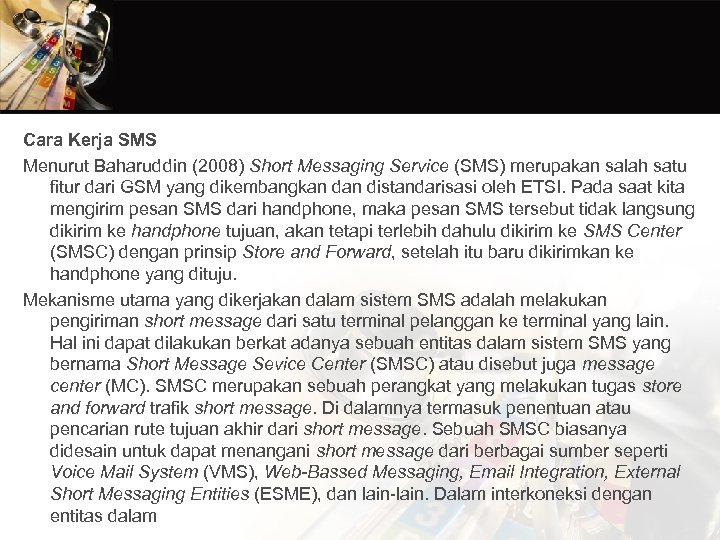 Cara Kerja SMS Menurut Baharuddin (2008) Short Messaging Service (SMS) merupakan salah satu fitur dari GSM yang dikembangkan distandarisasi oleh ETSI. Pada saat kita mengirim pesan SMS dari handphone, maka pesan SMS tersebut tidak langsung dikirim ke handphone tujuan, akan tetapi terlebih dahulu dikirim ke SMS Center (SMSC) dengan prinsip Store and Forward, setelah itu baru dikirimkan ke handphone yang dituju. Mekanisme utama yang dikerjakan dalam sistem SMS adalah melakukan pengiriman short message dari satu terminal pelanggan ke terminal yang lain. Hal ini dapat dilakukan berkat adanya sebuah entitas dalam sistem SMS yang bernama Short Message Sevice Center (SMSC) atau disebut juga message center (MC). SMSC merupakan sebuah perangkat yang melakukan tugas store and forward trafik short message. Di dalamnya termasuk penentuan atau pencarian rute tujuan akhir dari short message. Sebuah SMSC biasanya didesain untuk dapat menangani short message dari berbagai sumber seperti Voice Mail System (VMS), Web-Bassed Messaging, Email Integration, External Short Messaging Entities (ESME), dan lain-lain. Dalam interkoneksi dengan entitas dalam