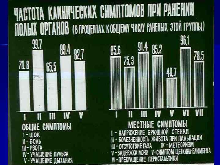 Косвенные признаки проникающих ранений n n n боли по всему животу, рвота, задержка газов, метеоризм, задержка мочи(в половине случаев), учащение пульса, Учащение дыхания, напряжение брюшной стенки болезненность при пальпации живота, выраженный симптом Щеткина-Блюмберга, отсутствие печеночной тупости. В боковых каналах живота - укорочение перкуторного звука свидетельствует об излившейся крови, желчи, моче