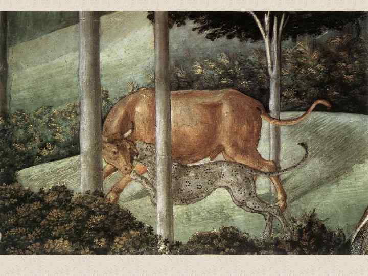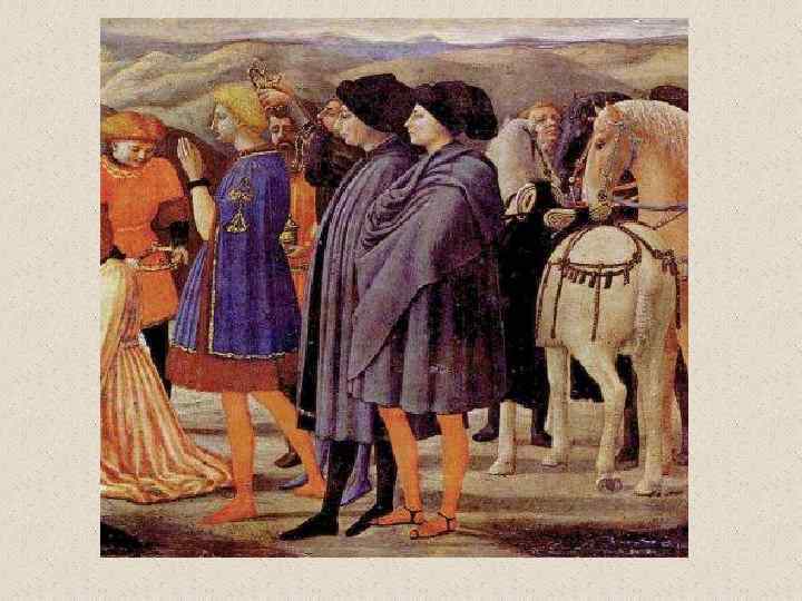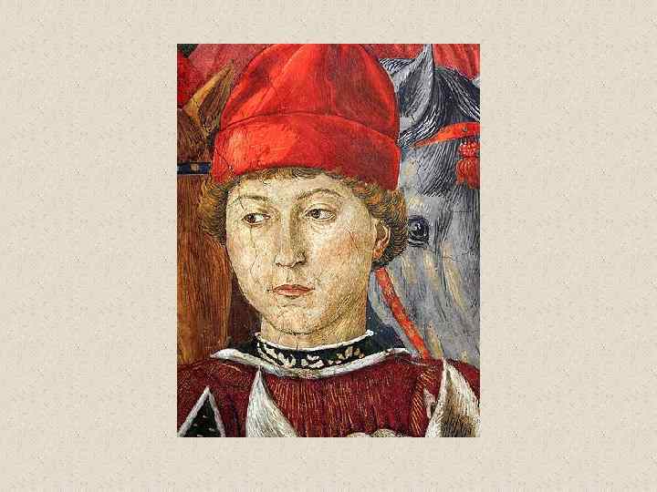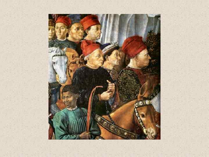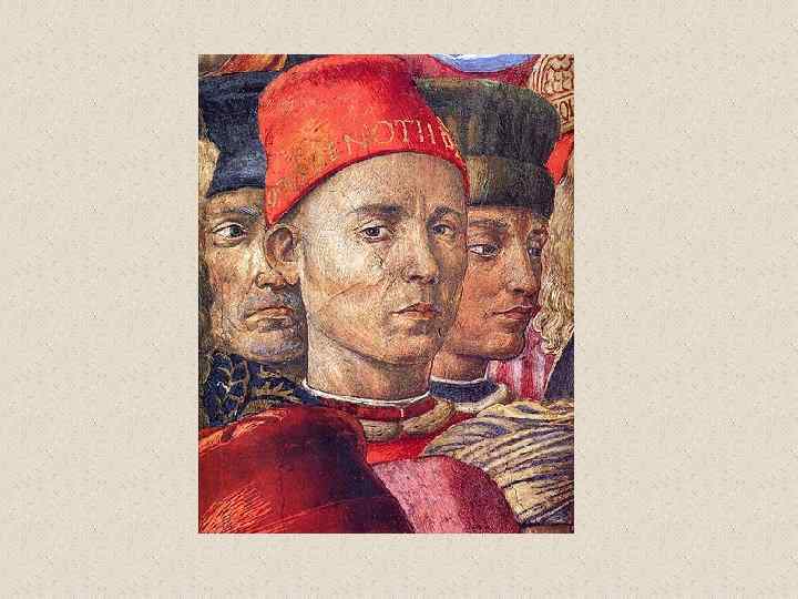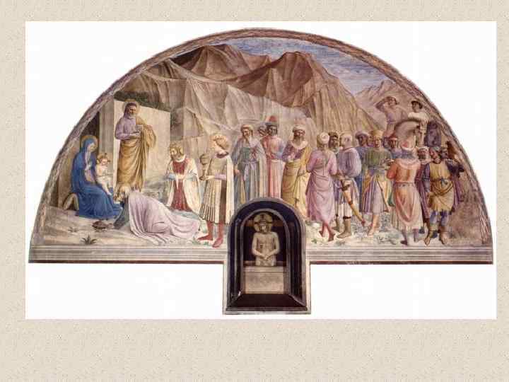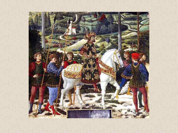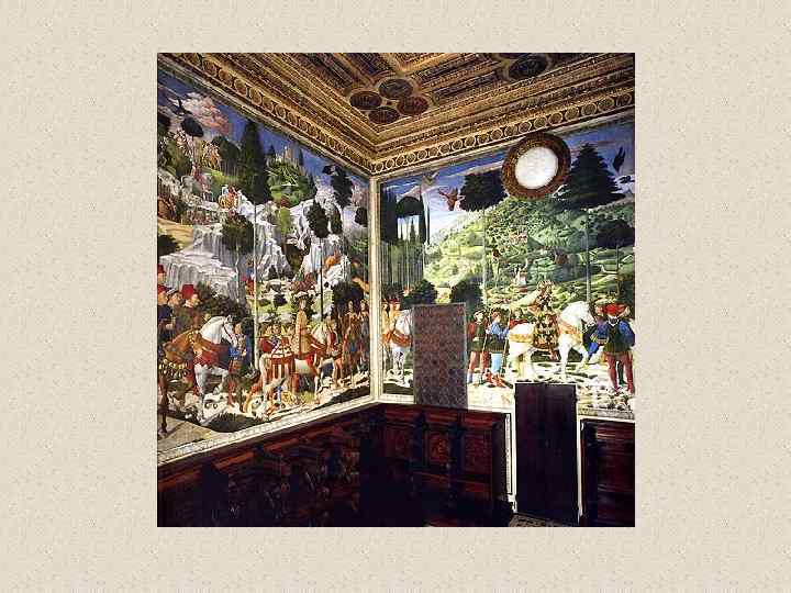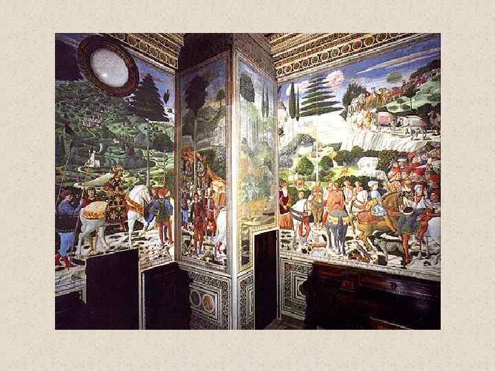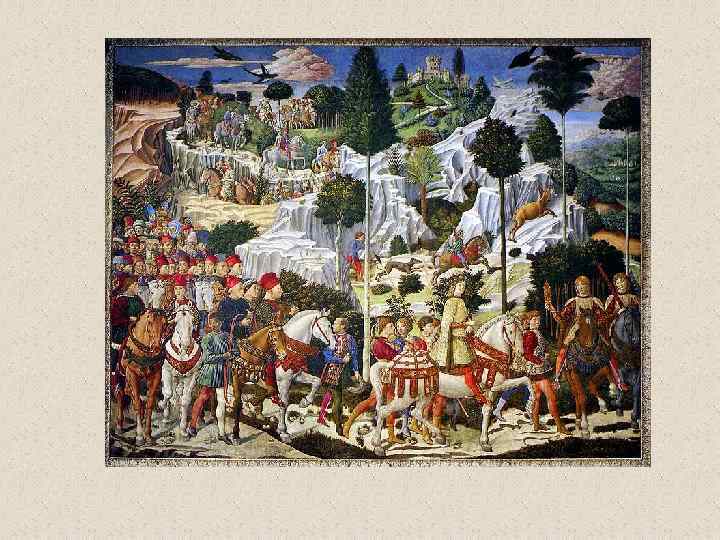 Бенноцо Гоццоли (1420 -1497) • флорентийский художник эпохи Возрождения. Его настоящее имя Беноццо ди Лезе ди Сандро (Benozzo di Lese di Sandro); фамилия Гоццоли впервые появилась во втором издании Жизнеописаний наиболее знаменитых живописцев, ваятелей и зодчих Вазари. Родился во Флоренции. С 1444 в течение трех лет помогал скульптору Лоренцо Гиберти при создании рельефов восточных (т. н. Райских) дверей Флорентийского баптистерия. В 1447 работал вместе с Фра Анджелико над фресками капеллы папы Николая V в Ватикане и капеллы Сан Брицио в соборе Орвьето. Работа с Фра Анджелико оказала большое влияние на все искусство Беноццо, которое даже в последние годы жизни мастера оставалось в русле готического стиля, несмотря на то, что в флорентийской живописи этого времени уже преобладали ренессансные тенденции. • Гоццоли известен прежде всего как мастер фрески. Наиболее известные из выполненных им циклов - росписи, посвященные жизни св. Франциска (Монтефалько, 1450 -1452), Шествие волхвов (Флоренция, палаццо Медичи-Риккарди, 1459), сцены из жизни св. Августина (Сан Джиминьяно, 1463 -1465) и изображения на Ветхозаветные сюжеты (Кампосанто, Пиза, 14671485). • Помимо работы по заказам Медичи, деятельность Гоццоли протекала главным образом за пределами Флоренции. Его перегруженные деталями и фигурами композиции, исполненные в манере, сильно напоминающей произведения мастеров треченто, не могли конкурировать с полными ясности и внутренней энергии творениями ведущих флорентийских живописцев его времени.
