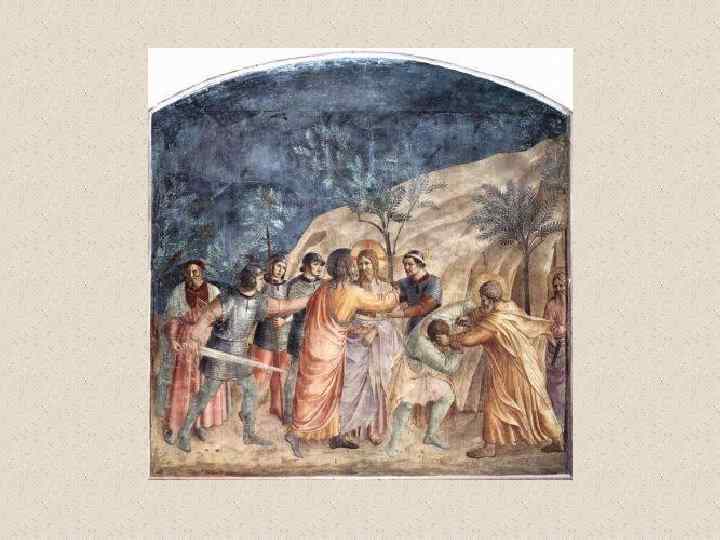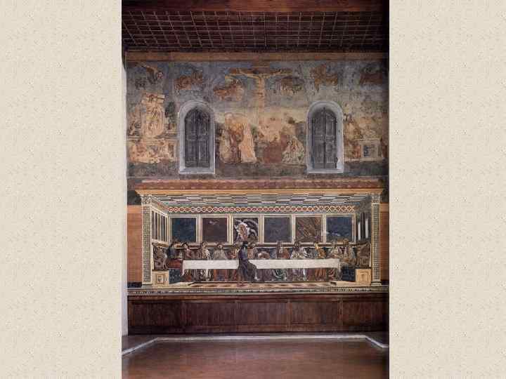 Во фреске «Тайная вечеря» в церкви Санта Аполлония во Флоренции он создает изображение замкнутого интерьера с длинным столом посредине, за которым восседают Христос и апостолы. Иуду он помещает отдельно, по другую сторону стола, подчеркивая тем самым его враждебность к остальным участникам события Тайная вечеря. Около 1447 -1449 гг. Фреска. Трапезная монастыря Сант Аполлония. Флоренция.