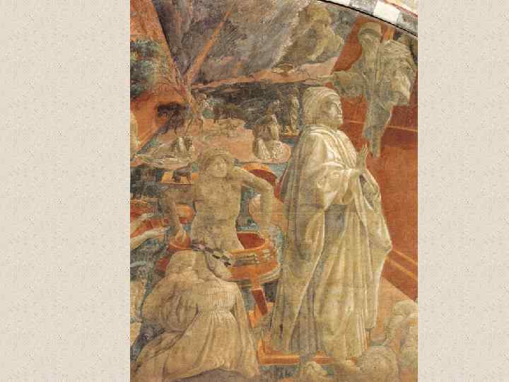 Портрет Фарината дельи Уберти Около 1455 300 x 179 см Фреска Флоренция. Сантиссима Аннунциата Фарината дельи Уберти — образ более сложный; в отличие от примитивной импульсивности Пиппо Спано, это человек богатой духовной жизни. Выполненный с таким же пластическим совершенством, еще более выдвинутый за пределы рамы, он обращает на себя внимание своим гордым презрительным обликом, лицом вольнодумца. Следуя учению Эпикура, Фарината, по словам Данте, поместившего в ад, считал, что «души с плотью гибнут безвозвратно» .
