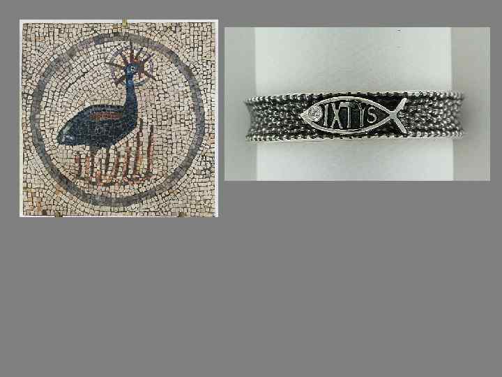 Основные символы. Добрый Пастырь. «Я есьм пастырь добрый» Виноградная лоза. Символ крови Христовой. Голубь — символ св. Духа Агнец — символ жертвы, Христа. «Вот агнец Божий, который берет на себя грех мира» Павлин — символ бессмертия. Считали, что мясо павлина не разлагается. Пеликан — символ жертвы. Павлин отдает свое мясо детям. Феникс — символ воскресения Рыба - один из первых символов Христа.