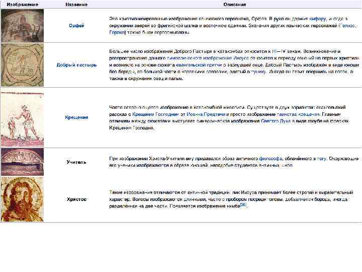 Реконструкция Кубикулы пап в катакомбах святого Каллиста Виды захоронений Кубикулами назывались небольшие камеры, расположенные по сторонам основных ходов. Дословно cubiculum означает «покой» , покой для сна умерших. В кубикулах располагались захоронения нескольких человек, чаще всего они являлись фамильными склепами. Обнаружены кубикулы, в которых насчитывается до 70 ти и более локулов разной величины, расположенных в 10 и более рядов. Локулы (дословно «местечки» ) являются наиболее распространённой формой захоронений в катакомбах. Предназначены для захоронения как одного человека, так и нескольких (лат. loculi bisomi, trisomi…). Выполнялись в форме четырёхугольных продолговатых углублений в стенах коридоров катакомб или в кубикулах Аркосолий — невысокая глухая арка в стене, под ней в гробнице помещали останки усопших. Таким образом, отверстие гробницы располагалось не сбоку, а сверху. Этот более дорогой тип захоронений известен ещё с античности. В них чаще всего хоронили мучеников и использовали надгробную плиту как алтарь при совершении литургии. Чаще встречаются в кубикулах, чем в коридорах катакомб.