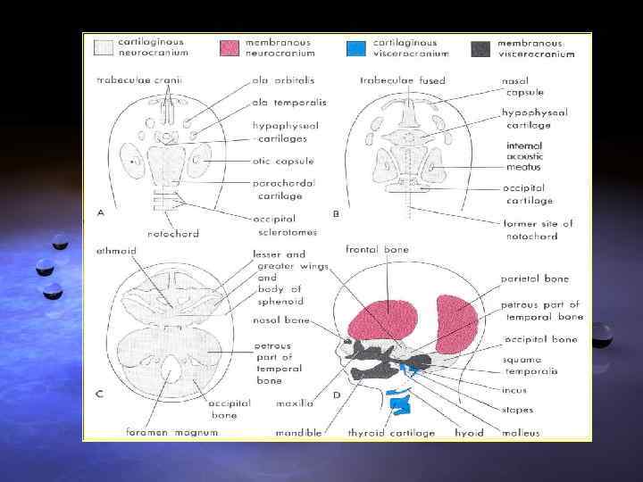 Развитие мозгового черепа • 1 стадия –перепончатый череп • 2 стадия – хрящевой череп • 3 стадия – костный череп