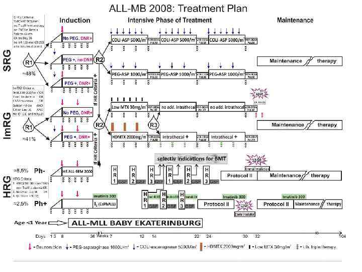 диагностика Исследование ликвора диагностика нейролейкоза Биохимический анализ крови мочевая кислота, Са, К, фосфаты, мочевина, АСТ, АЛТ, ЛДГ, ЩФ) Для оценки соматического статуса коагулограмма R-графия органов грудной клетки УЗИ органов брюшной полости и сердца ЭКГ серологичсекие исследования (гормоны, АТ к вирусам (ВГ, CMV, HSV, EBV и т. п. ), микроорганизмам) общий анализ мочи микробиологическое исследование (мазки и бак посевы биол. сред)