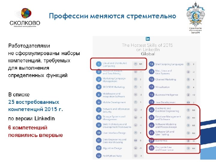 Надпрофессиональные навыки Мультиязычность и мультикультурность (свободное владение английским и знание второго языка, понимание национального и культурного контекста стран -партнеров, понимание специфики работы в отраслях в других странах). Навыки межотраслевой коммуникации (понимание технологий, процессов и рыночной ситуации в разных смежных и несмежных отраслях). Умение управлять проектами и процессами, искусственным интеллектом. Бережливое производство, управление производственным процессом, основанное на постоянном стремлении к устранению всех видов потерь, что предполагает вовлечение в процесс оптимизации бизнеса каждого сотрудника и максимальную ориентацию на потребителя. Способность к художественному творчеству, наличие развитого эстетического вкуса. Экологическое мышление Работа в условиях неопределенности
