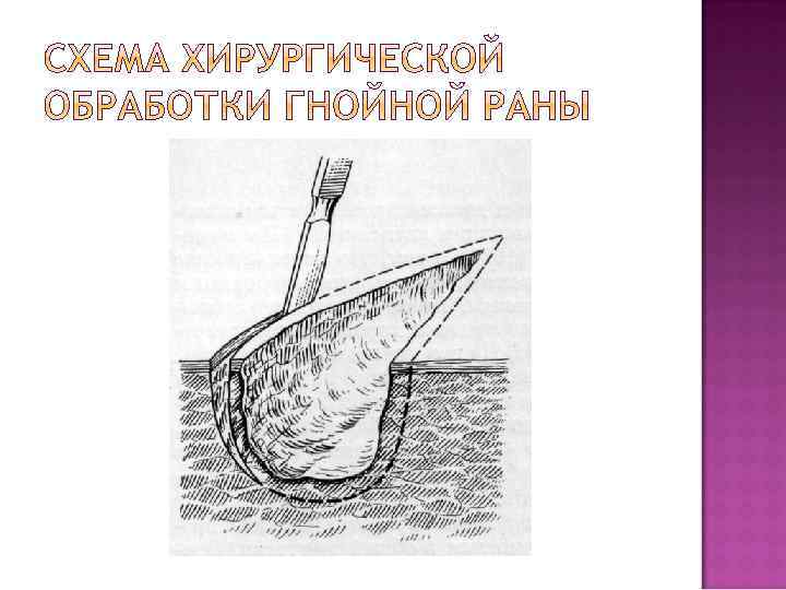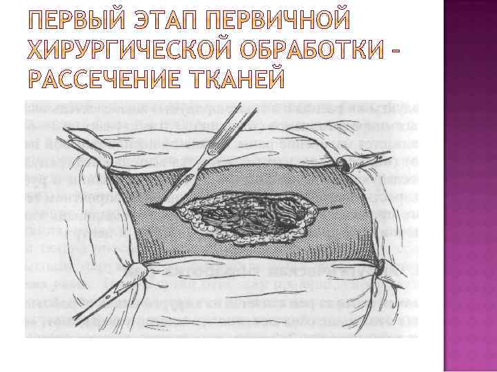 - рассечение ран иссечение пораженных тканей остановка кровотечения ревизия раны удаление инородных тел дренирование наложение швов