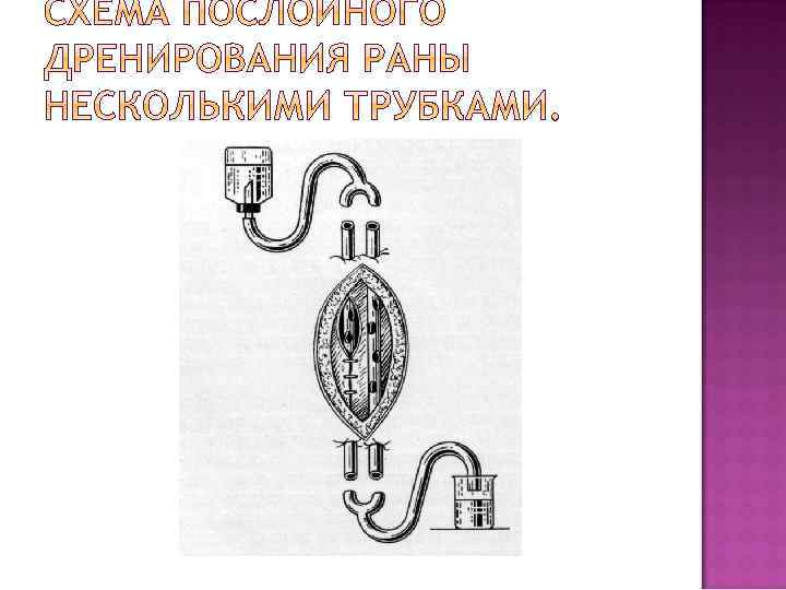 отток отделяемого по силе тяжести капиллярные всасывающие свойства дренажа по типу керосиновой лампы активное дренирование раны. - длительное промывание раны с удалением экссудата, дендрита и подвод антибиотиков к ране. - аспирация при колющих