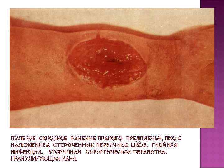 В связи с наличием неизбежного травматического отека, остатками нежизнеспособных тканей происходит беспрепятственный рост микрофлоры, главным образом при зашитой коже. Именно поэтому стали применять так называемый отсроченный шов, который может быть наложен между 4 и 7 днями. Наиболее правильно называть его отсроченно-первичным швом.