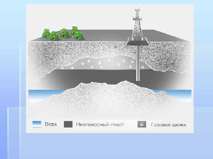 § Разведка и добыча нефти § Знакомый силуэт станка-качалки стал своеобразным символом нефтедобывающей отрасли. Но до того, как наступает его черед, геологи и нефтяники проходят долгий и трудный путь. А начинается он с разведки месторождений. В природе нефть располагается в пористых породах, в которых жидкость может накапливаться и перемещаться. Такие породы называют коллекторами. Важнейшими коллекторами нефти являются пески, песчаники, конгломераты и трещиноватые породы. Но чтобы образовалась залежь, необходимо присутствие так называемых покрышек – непроницаемых пород, которые препятствуют миграции. Обычно пласт-коллектор расположен под уклоном, поэтому нефть и газ просачиваются вверх. Если их выходу на поверхность мешают складки породы и другие препятствия, образуются ловушки. Верхнюю часть ловушки иногда занимает слой газа – «газовая шапка» . Таким образом, чтобы обнаружить месторождение нефти, необходимо найти возможные ловушки, в которых она могла скопиться. Сначала потенциально нефтеносный район исследовали визуально, научившись выявлять присутствие нефтяных залежей по многим косвенным признакам. Однако чтобы поиски были максимально успешными, необходимо уметь «видеть под землей» . Это стало возможным благодаря геофизическим методам исследования. Наиболее эффективным инструментом оказался сейсмограф, который был предназначен для регистрации землетрясений. Его способность улавливать механические колебания пригодилась в геологоразведочном деле. Колебания от взрывов динамитных снарядов преломляются подземными структурами, и, регистрируя их, можно определить расположение и форму подземных пластов. Конечно, важным методом исследования является опорное бурение. Керн, полученный из глубоких скважин, тщательно изучается по слоям геофизическими, геохимическими, гидрогеологическими и другими методами. Для такого вида исследований бурятся скважины глубиной до 7 километров. § § §