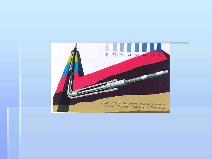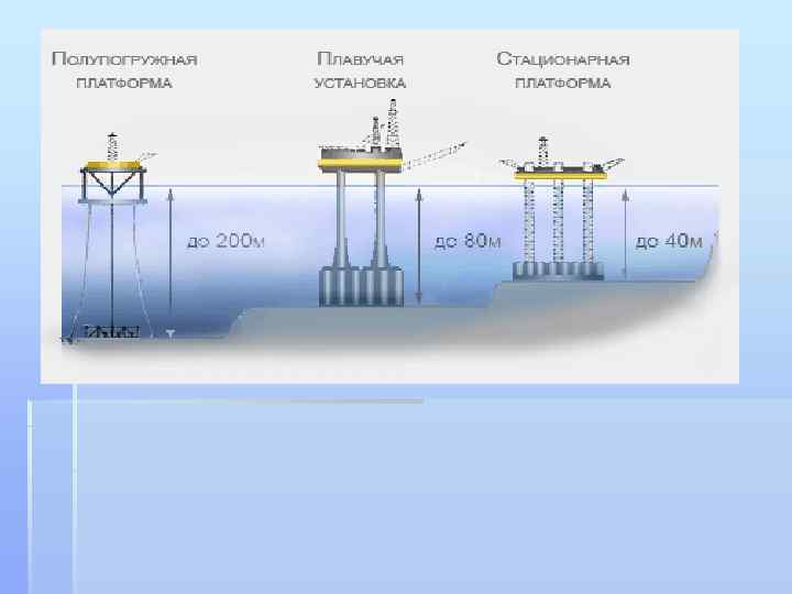 § § Добыча нефти на шельфе Буровая платформа – сложное техническое сооружениие, предназначенном для добычи нефти на морском шельфе. Прибрежные месторождения нередко продолжаются на расположенной под водой части материка, которую и называют шельфом. Его границами служат берег и так называемая бровка – четко выраженный уступ, за которым глубина стремительно возрастает. Обычно глубина моря над бровкой составляет 100 -200 метров, но иногда она доходит и до 500 метров, и даже до полутора километров, например, в южной части Охотского моря или у берегов Новой Зеландии. В зависимости от глубины применяют различные технологии. На мелководье обычно сооружают укрепленные «острова» , с которых и осуществляют бурение. Именно так нефть издавна добывалась на Каспийских месторождениях в районе Баку. Применение такого способа, особенно в холодных водах, часто сопряжено с риском повреждения нефтедобывающих «островов» плавучими льдами. Например, в 1953 году, большой ледяной массив, оторвавшийся от берега, уничтожил около половины нефтедобывающих скважин в Каспийском море. Реже применяется технология, когда нужный участок окантовывают дамбами и откачивают воду из образовавшегося котлована. При глубине моря до 30 метров раньше сооружались бетонные и металлические эстакады, на которых размещали оборудование. Эстакада соединялась с сушей или же представляла собой искусственный остров. Впоследствии эта технология утратила актуальность. Если месторождение располагается близко к суше, есть смысл бурить наклонную скважину с берега. Одна из наиболее интересных современных разработок – дистанционное управление горизонтальным бурением. Специалисты осуществляют контроль прохождения скважины с берега. Точность процесса настолько высока, что можно попасть в нужную точку с расстояния в несколько километров. В феврале 2008 года корпорацией Эксон Мобил (Exxon Mobil) установлен мировой рекорд в бурении подобных скважин в рамках проекта «Сахалин-1» . Протяженность ствола скважины здесь составила 11 680 метров. Бурение осуществлялось сначала в вертикальном, а затем в горизонтальном направлении под морским дном наместорождении Чайво в 8 -11 километрах от берега.