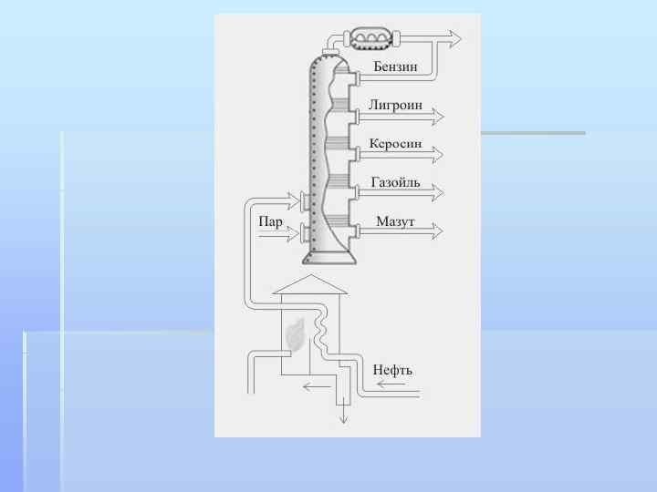 § § Нефть делят на фракции в зависимоcти от температуры кипения и плотности. В лаборатории проводят «тренировочную» перегонку, чтобы узнать, какое количество бензина, керосина, смазочных масел, парафина и мазута можно получить из поступившей на завод нефти. (Нефти сильно различаются по химическому составу, поэтому из одних можно получить больше смазочных масел и парафинов, из других – больше бензина. ) И только после этого приступают к промышленной перегонке. Этот процесс происходит в ректификационной колонне – специальном аппарате для разделения нефти на фракции. высота такой колонны может превышать 60 м. Будучи настоящим произведением технологического искусства, она позволяет разделить субстанции, температура кипения которых отличается менее чем на 6 o. С. Нефть, нагретую в змеевике до 320 -390 o. С, подают в колонну в виде смеси горячей жидкости и пара. Там пары тяжелых, а потом легких фракций последовательно конденсируются и оседают на специальных тарелках – их может быть от 30 до 60. В результате получают прямогонный бензин (температура кипения 30 -160 o. С), нафту, которую еще называют лигроином (105 -160 o. С), керосин (160 -230 o. С), газойль (230 -400 o. С) и мазут, остающийся после отделения остальных фракций. Бензин и нафту затем подвергают каталитическому риформингу. При температуре 320 -520 o. С и давлении в 15 -40 атмосфер в присутствии платиновых катализаторов получают бензин с высоким октановым числом и ароматические углеводороды – бензол, толуол, ксилол и другие. Последние используются в качестве сырья для нефтехимической промышленности. Кроме того, во время процесса риформинга выделяется водород, который можно использовать, например, для гидроочистки.