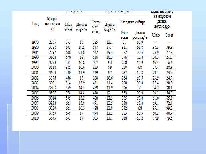 § которое за 10 лет (1969 -1979 гг) дало 1 млрд. тонн нефти. В 1978 г Западная Сибирь обеспечивала уже 44% всей добывающейся нефти в СССР. В эти годы советская нефть спад добычи составил около 38 млн. тонн нефти (со 150 млн. в 1980 г до 112, 2 млн. в 1985 г). И хотя в 1988 г наша страна была крупнейшим нефтепроизводителем в мире (11, 4 млн. баррелей в день), с объемом добычи значительно выше, чем в США и Саудовской Аравии, существенное падение добычи уже невозможно было удержать из-за несовершенства технологий. Советский Союз смог сдержать падение добычи только до начала 1980 г. И если в 80 -е годы добыча нефти и газа составляла 550570 млн. т/год, то в годы реформ её объём сократился почти в 2 раза – до 303 -305 млн. т/год. Начиная с 90 -х годов, объемы добычи неуклонно снижались, что было вызвано снижением темпов развития сырьевой базы, объемов геологоразведочных работ. О кризисной ситуации в нефтяной промышленности бывшего СССР свидетельствуют данные о стремительном падении его роли и места в мировой добыче нефти в период 1988 -1993 гг( С начала XXІ -го века мировая экономика стала восстанавливаться после кризиса 2008 -2009 г. г. , что стало одним из факторов роста спроса на энергоносители, прежде всего на нефть. По итогам 2010 г. добыча нефти в мире составила около 3843 млн тонн, что на 2. 4% превысило уровень 2009 г. (табл. 1). В России было добыто 505 млн. тонн нефти и 650 млрд. м 3 газа, что составило более 18% мирового производства углеводородов (УВ) в пересчёте на энергетический эквивалент и позволило обеспечить первое место в мире по обеим товарным позициям. §