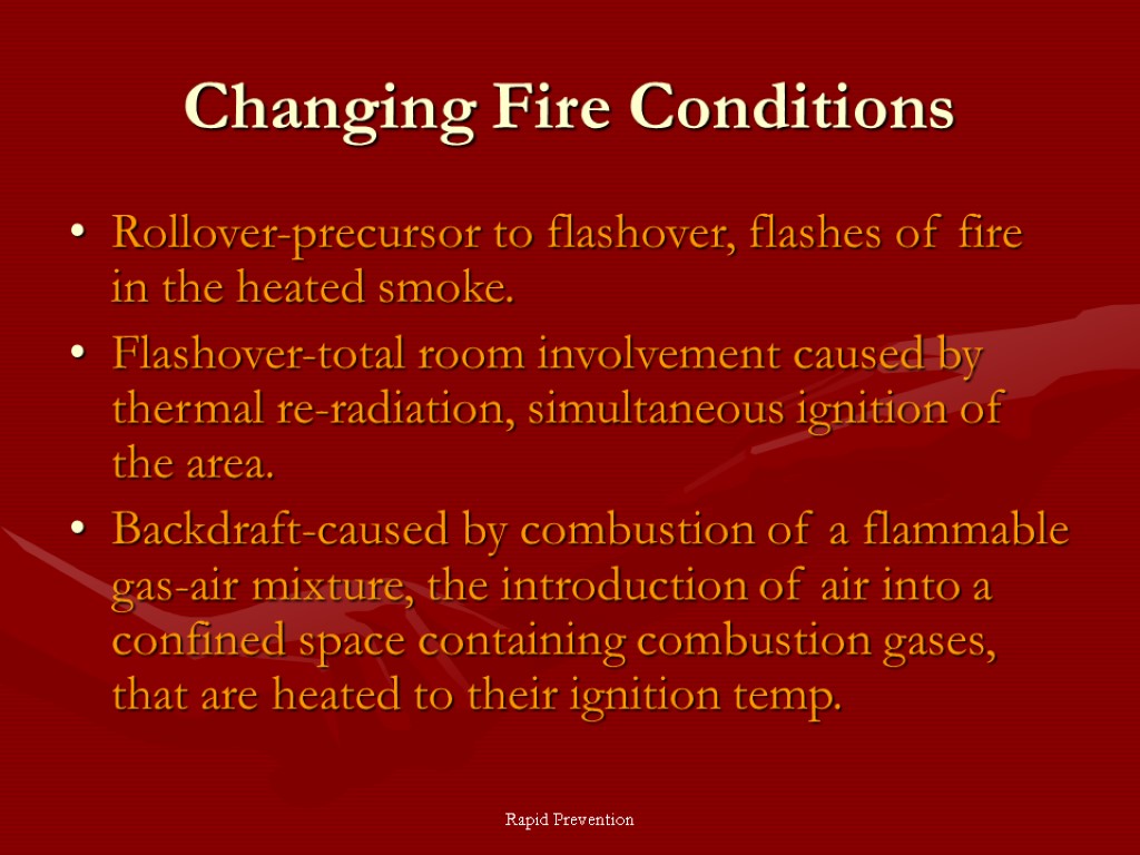 Rapid Prevention Changing Fire Conditions Rollover-precursor to flashover, flashes of fire in the heated smoke. Flashover-total room involvement caused by thermal re-radiation, simultaneous ignition of the area. Backdraft-caused by combustion of a flammable gas-air mixture, the introduction of air into a confined space containing combustion gases, that are heated to their ignition temp.