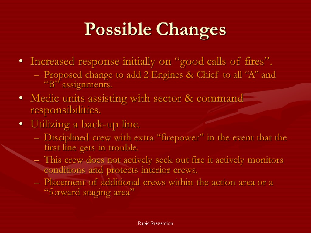 Rapid Prevention Possible Changes Increased response initially on “good calls of fires”. Proposed change to add 2 Engines & Chief to all “A” and “B” assignments. Medic units assisting with sector & command responsibilities. Utilizing a back-up line. Disciplined crew with extra “firepower” in the event that the first line gets in trouble. This crew does not actively seek out fire it actively monitors conditions and protects interior crews. Placement of additional crews within the action area or a “forward staging area”