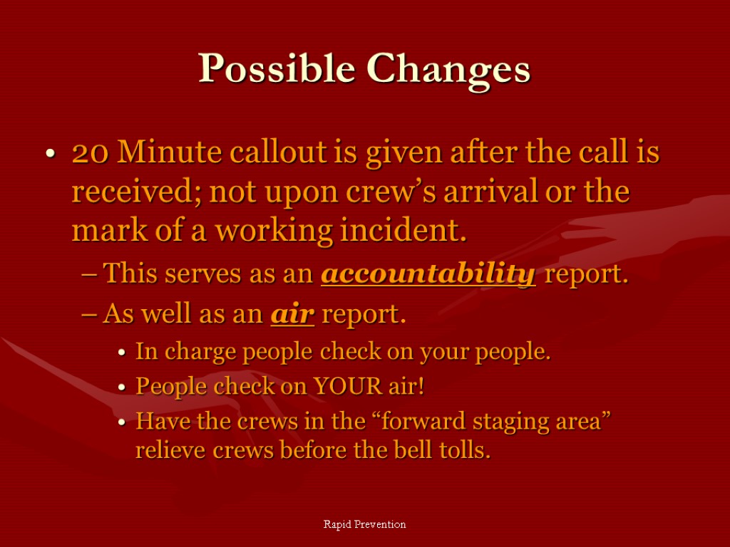 Rapid Prevention Possible Changes 20 Minute callout is given after the call is received; not upon crew’s arrival or the mark of a working incident. This serves as an accountability report. As well as an air report. In charge people check on your people. People check on YOUR air! Have the crews in the “forward staging area” relieve crews before the bell tolls.